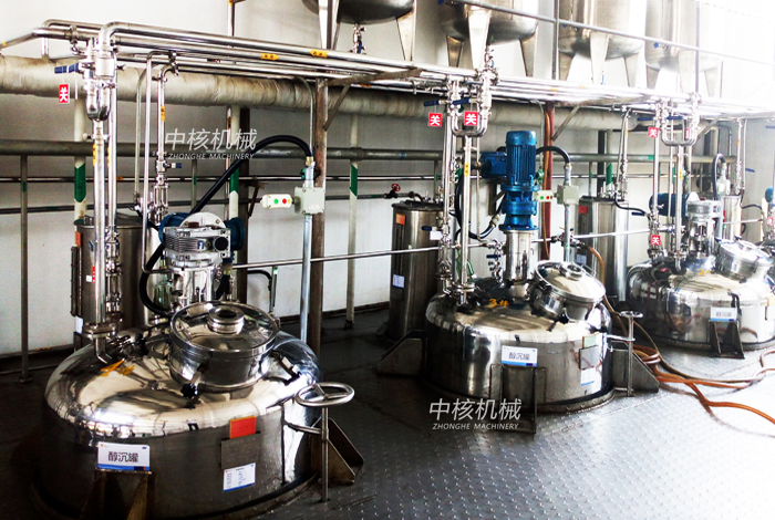 中藥水煎濃縮液(一般比重為1.2左右),去除非醇溶性的淀粉、蛋白質(zhì)等,采用加入酒精配成一定醇度的液體,然后常溫最好是低溫冷凍沉降進行固液分離以提高中藥提取液的純度及澄明度,從而提高產(chǎn)品質(zhì)量。濃縮液和酒精按工藝要求,投入各自的配比量并開啟冷凍鹽水或冷卻水,攪拌混和均勻,達到料液所需的溫度后停止攪拌,繼續(xù)在夾套內(nèi)通入冷凍鹽水或冷卻水,保證所需的液溫。待沉淀完成后開啟上清液出料閥放料。
