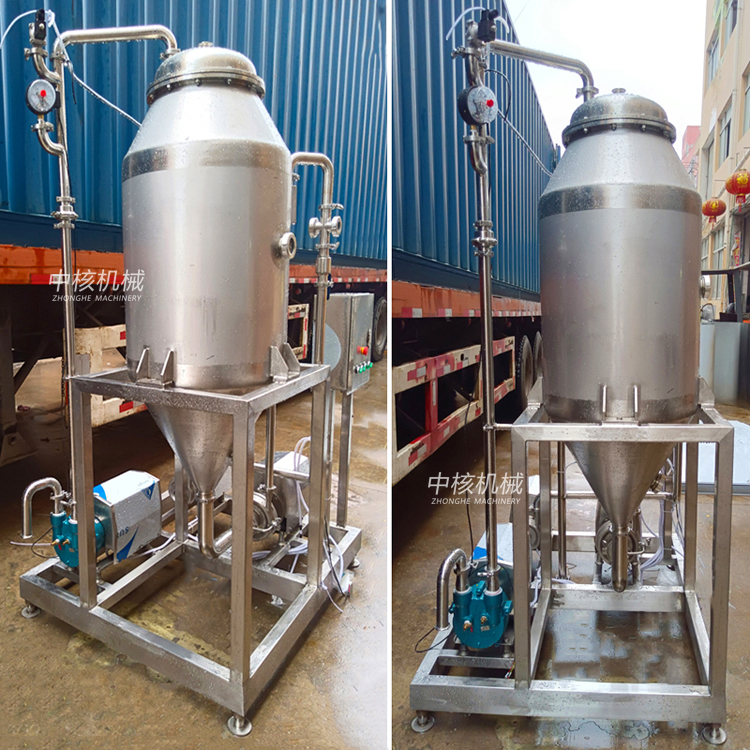 3、開啟視燈,開啟真空泵,待真空度到-0.07~-0.08Mpa左右時,打開進(jìn)料閥,物料從進(jìn)料口自吸進(jìn)入罐內(nèi),當(dāng)物料升至一定位置時(在視鏡處可以觀看到),開啟出料泵出料。